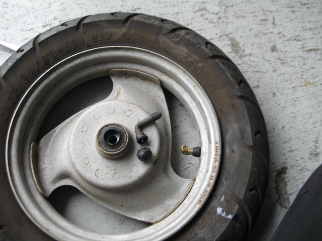 古くなると良くあるエアーバルブの劣化。原付、自二輪車、問わずチューブレスの場合タイヤ交換の時、点検出来れば交換をお勧めします、私の経験上バルブのゴムの部分に亀裂がある車輌て結構出会いますよ。