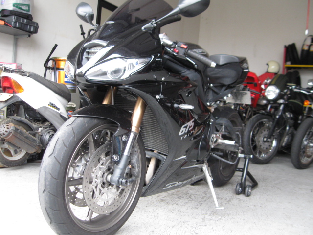 暖かいと、やはり仕事がすすみます。トライアンフデイトナ675車検整備完了、後は陸運局