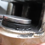 昭和バイク車検整備、フロントブレーキ清掃&点検中発見なんとキャリパーダストシールがはみ出てます、…